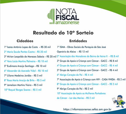 “A Secretaria de Fazenda adotou o sorteio itinerante para dar oportunidade a todos os que participam e os que ainda não conhecem a Campanha Nota Fiscal Amazonense de acompanhar a seleção dos ganhadores, constatando a lisura do processo. A resposta por parte da sociedade é imediata. Durante e ao final de cada sorteio, o número de CPFs inscritos aumenta consideravelmente”, comemorou o coordenador da NFA, auditor fiscal, Augusto Bernardo Cecílio.