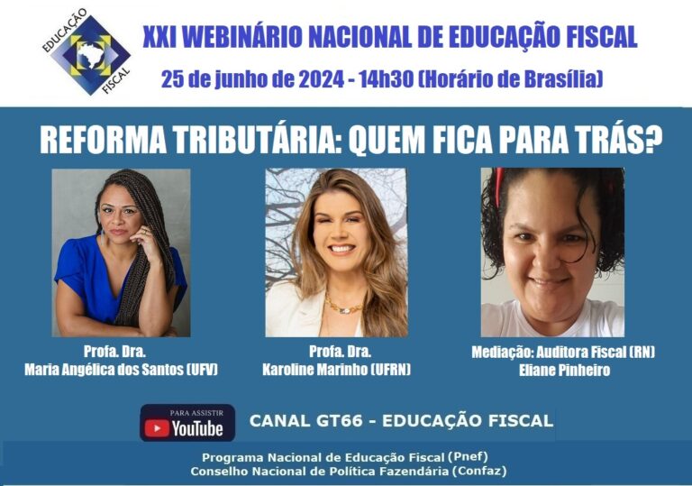 O Programa Nacional de Educação Fiscal, por meio de Grupo de Trabalho GT66/Confaz, realizará webinário sobre Reforma Tributária, na terça-feira, 25 de junho, a partir das 14h30 (horário de Brasília). As professoras
