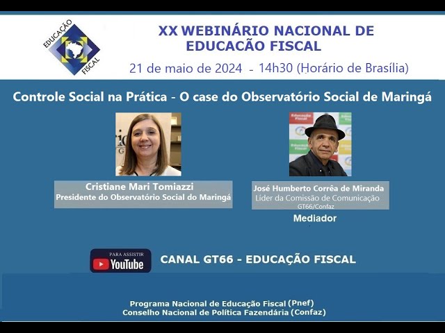 Nesta terça-feira (21/5) é dia de webinário nacional de Educação Fiscal! Você terá oportunidade de conhecer a excelência em Controle Social do Observatório Social de Maringá. A palestrante será Cristiane Mari Tomiazzi,