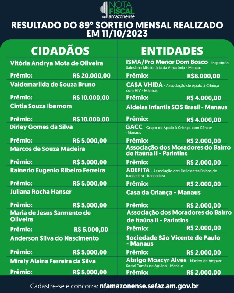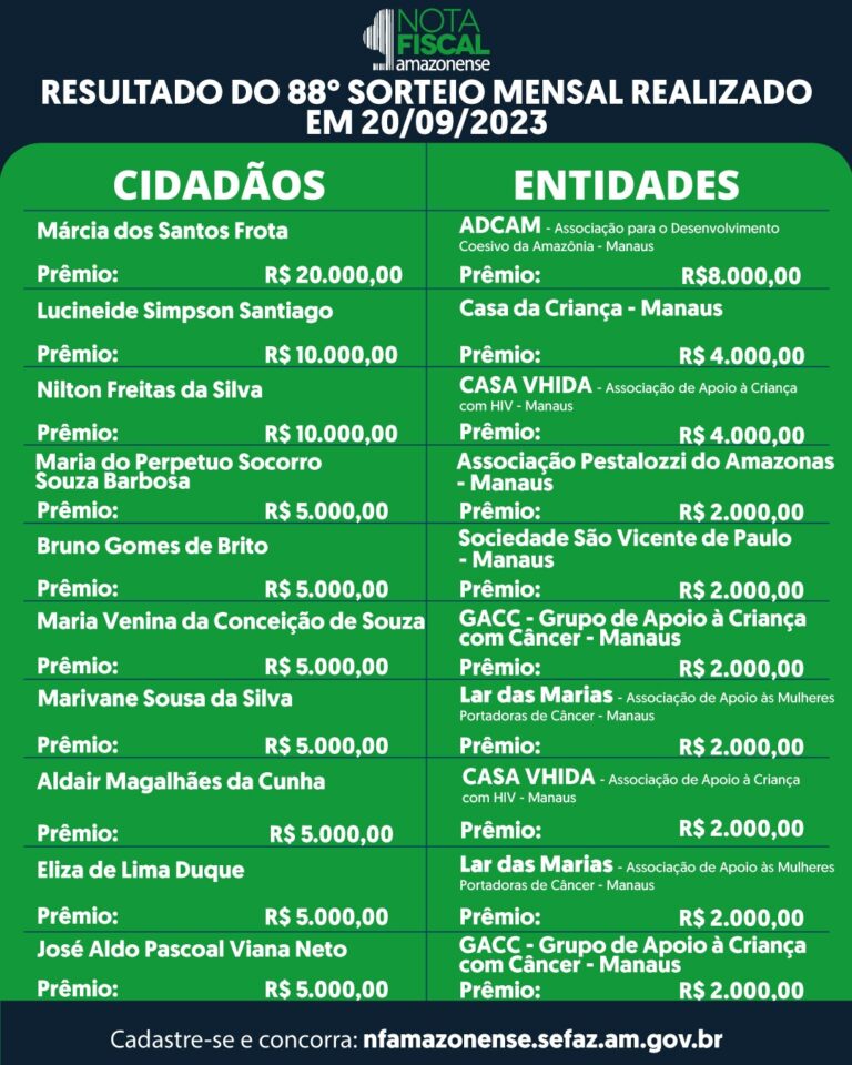 Entidades sociais, indicadas pelos ganhadores, também foram contempladas com prêmios de até R$ 8 mil Foram divulgados, nesta quarta-feira (11/09), os nomes dos ganhadores do 89º sorteio mensal da Campanha Nota Fiscal