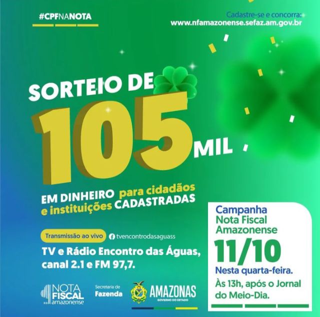 Estão concorrendo as pessoas cadastradas na Campanha que emitiram o CPF na nota ao longo do mês de setembro A Campanha Nota Fiscal Amazonense (NFA), promovida pelo Governo do Amazonas, por meio