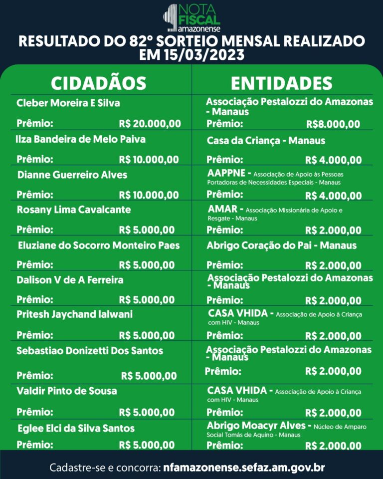 Veja a lista completa dos ganhadores do sorteio no link: https://localhost/notamig/nota-fiscal-amazonense/ganhadores/