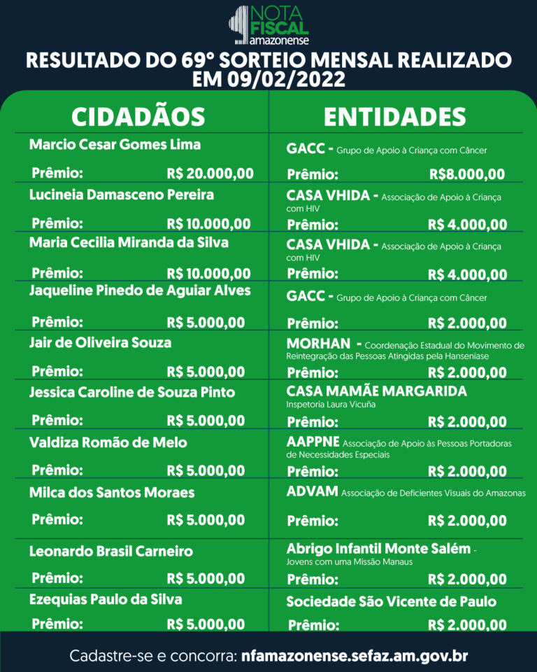 O sorteio mensal da Campanha Nota Fiscal Amazonense (NFA) acontecerá no dia 9 de fevereiro, na TV Encontro das Águas, após o Jornal do Meio-Dia. Por meio da Secretaria de Fazenda (Sefaz-AM),
