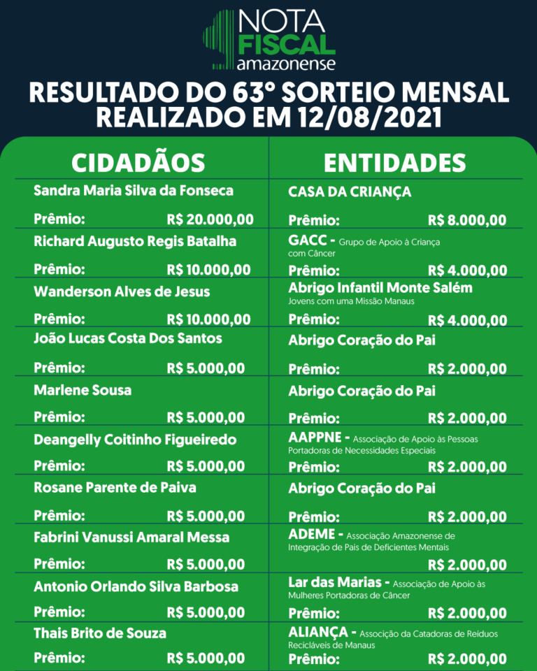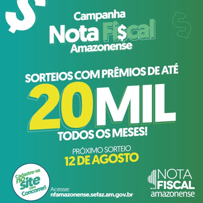Com prêmios de R$ 5 mil até R$ 20 mil, a Campanha Nota Fiscal Amazonense (NFA) realizará o 63º Sorteio Mensal nesta quinta-feira (12). Promovida pelo Governo do Amazonas por meio da