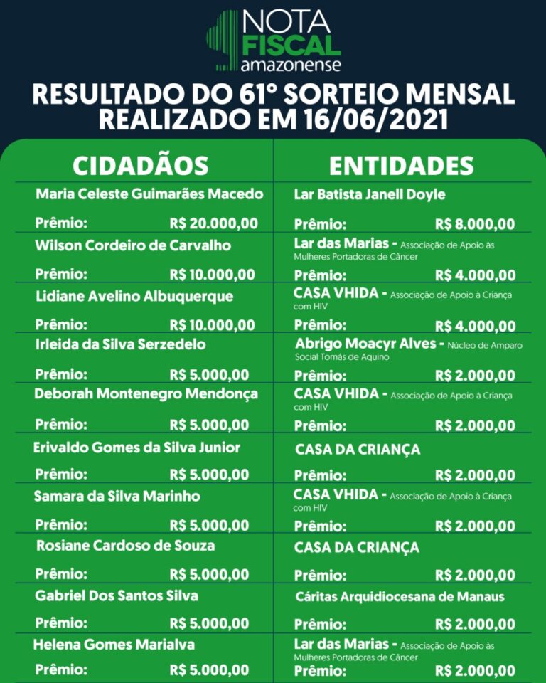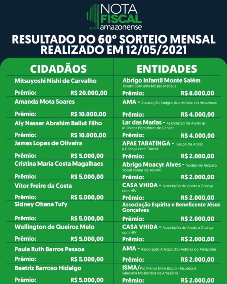 O sorteio mensal da Campanha Nota Fiscal Amazonense (NFA) acontecerá no dia 16 de junho. Serão mais de R$ 100 mil em prêmios para os sorteados entre os cidadãos que colocaram o
