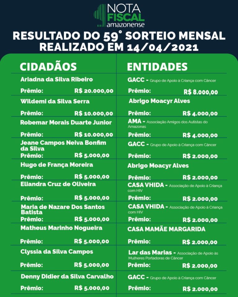 Mais de R$ 100 mil serão sorteados entre contribuintes que informaram CPF em compras feitas de 1º a 31 de março O sorteio mensal da Campanha Nota Fiscal Amazonense, referente ao