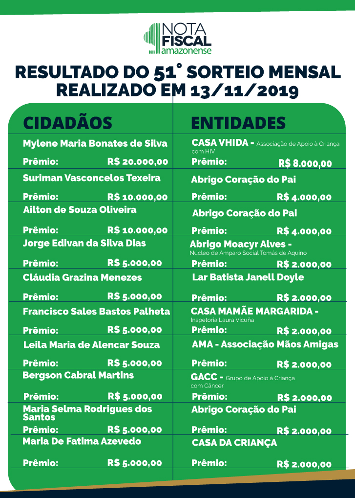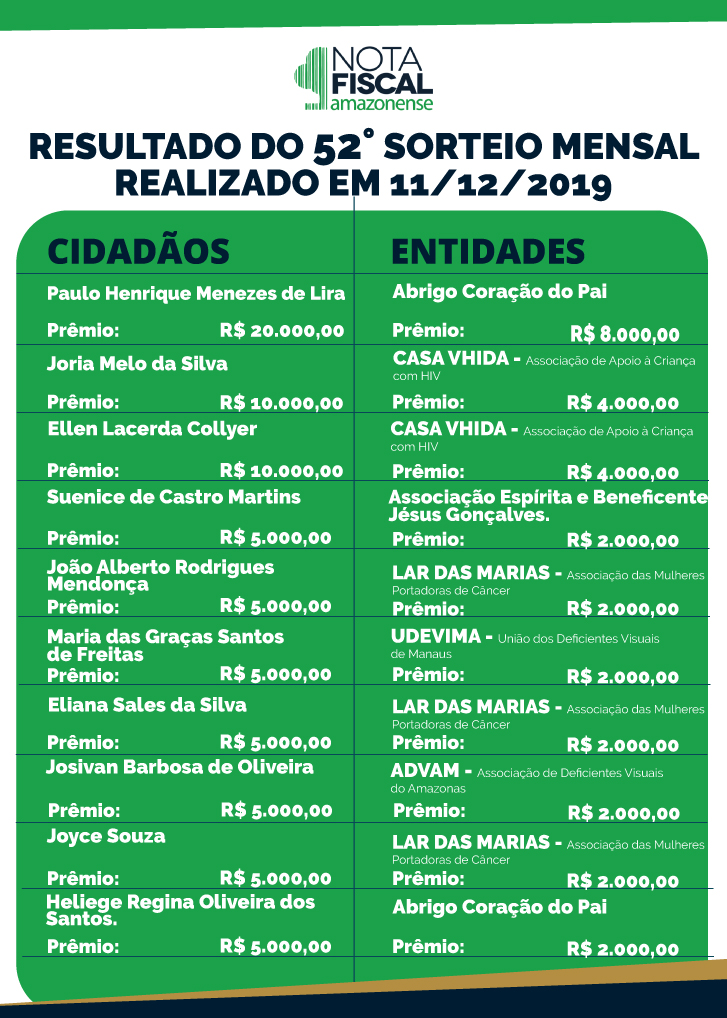 O último sorteio da campanha Nota Fiscal Amazonense em 2019 fez mais feliz o final de ano de pelo menos dez cidadãos e seis entidades sociais. Realizado na tarde quarta-feira (11), na