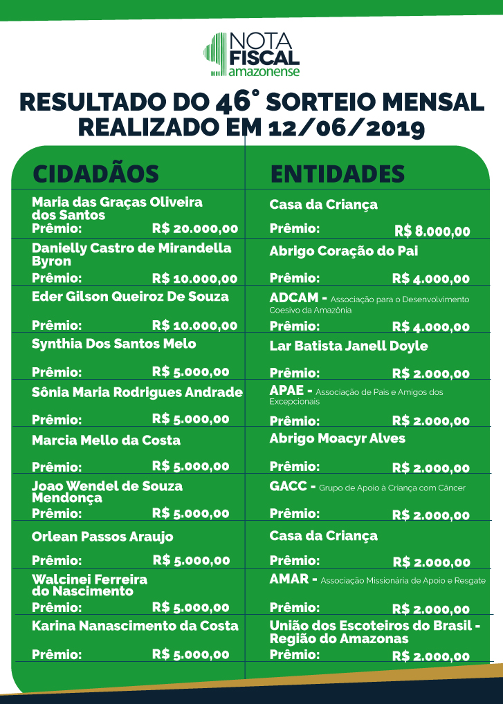 O pedreiro Arleson de Souza Vieria, de 37 anos, foi o grande vencedor do 45º Sorteio Mensal da Campanha Nota Fiscal Amazonense. A entrega dos cheques simbólicos dos sorteados e das instituições