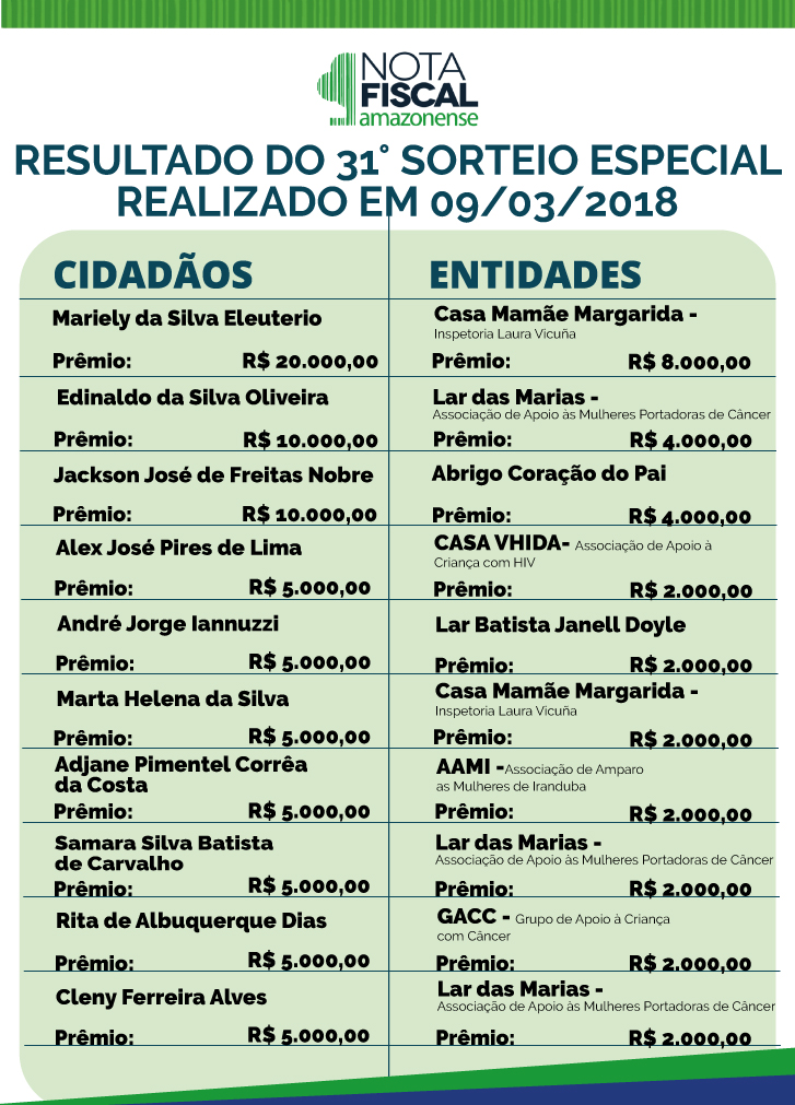 No segundo sorteio mensal da campanha Nota Fiscal Amazonense (NFA) de 2018, a Casa Mamãe Margarida foi a grande ganhadora. Indicada por dois padrinhos, a entidade irá receber R$ 10 mil da