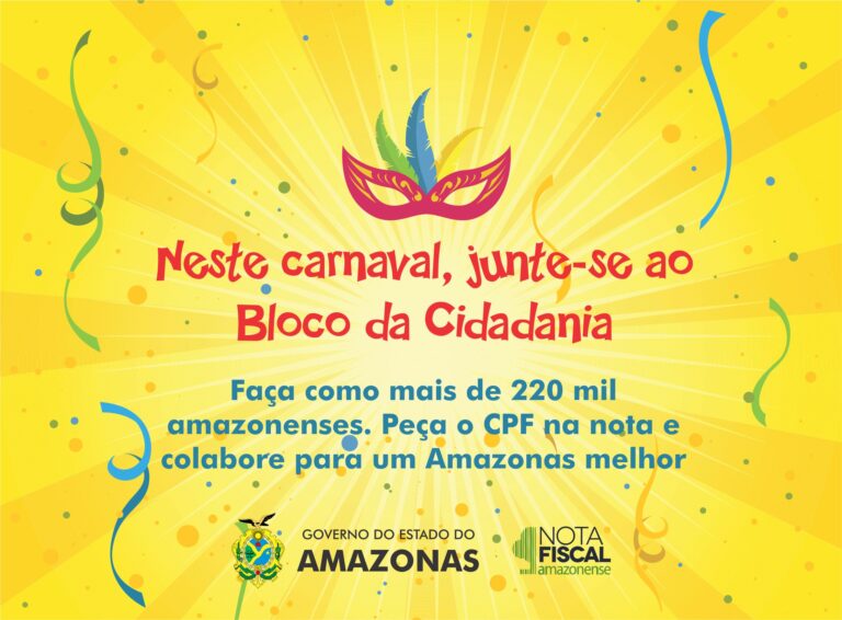 Neste carnaval, junte-se ao Bloco da Cidadania Faça como mais de 220 mil amazonenses. Peça o CPF na nota e colabore para um Amazonas melhor