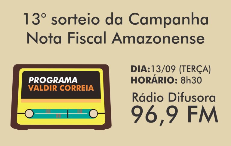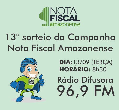 O 13º Sorteio da Campanha Nota Fiscal Amazonense ocorrerá dia 13/09 (terça-feira) ao vivo às 8h30, no Programa Valdir Correia, pela Rádio Difusora 96,9 FM.