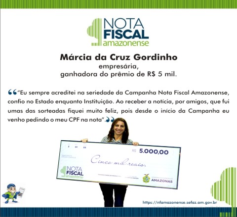 “Eu sempre acreditei na seriedade da Campanha Nota Fiscal Amazonense, confio no Estado enquanto Instituição. Ao receber a notícia, por amigos, que fui umas das sorteadas fiquei muito feliz, pois desde o
