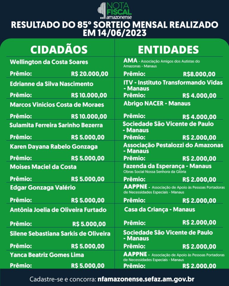 O próximo sorteio da Campanha Nota Fiscal Amazonense vai ocorrer na próxima quarta-feira (14/06). No sorteio da campanha promovida pelo Governo do Amazonas, por meio da Secretaria de Estado da Fazenda (Sefaz-AM),
