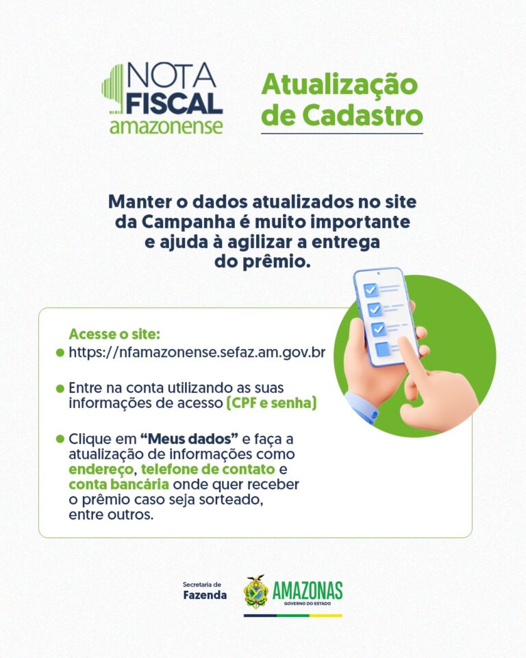Tem dúvidas de como atualizar os dados da Campanha Nota Fiscal Amazonense? É só seguir os passos descritos no Card! Manter os dados atualizados no cadastro é muito importante! Trocou de e-mail,
